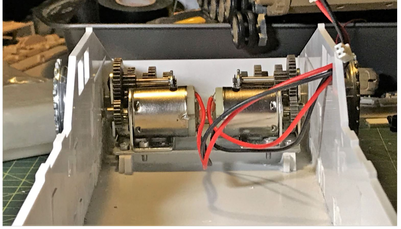 As the Mato gearbox comes with its own metal base plate with pre-drilled holes, a new plasticard mount at the proper height is created to support it. The Ludwig plasticard motor plate is discarded.