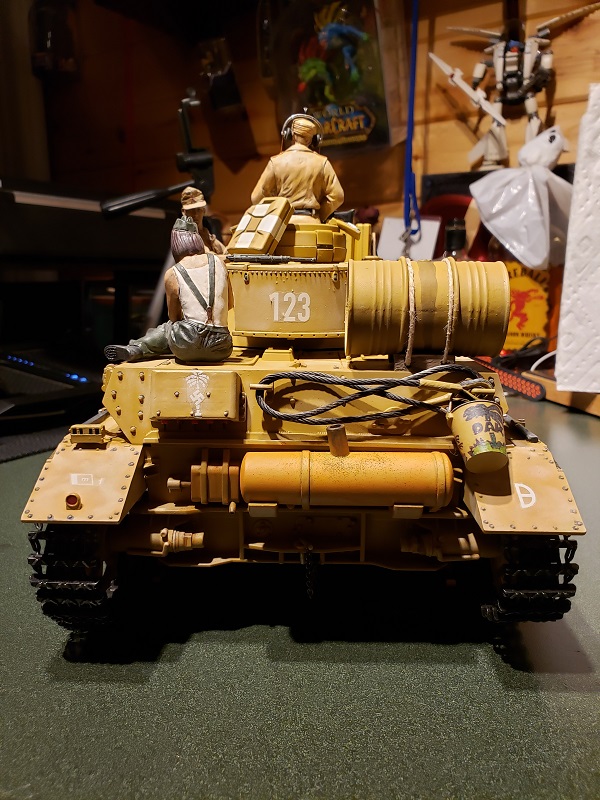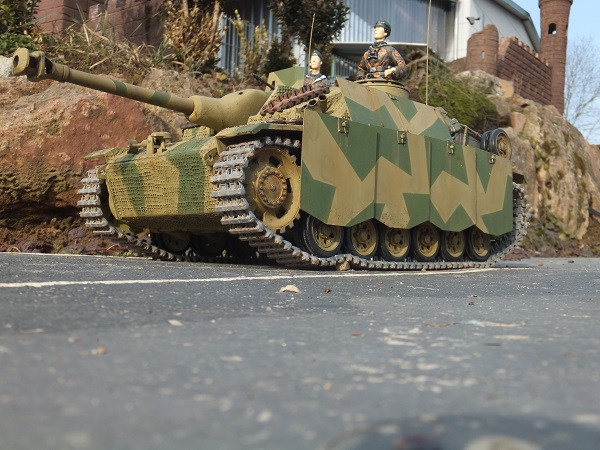 I don't have any Winter cammo'd Vehicles so you will have to deal with the 'Polar' opposite. Here is my Desert War 1942 DAK Panzer IV, 'Freda'. This tank was built out of Heng Long, Taigen and Tamiya components with a little scratch building and a lot of eye fooling detail added on. The Panzer was built and painted by me and is a culmination of a 'Want' kept for a long time on the dusty back shelving of my mind. Stock Heng Long gearboxes were smoothed and the suspension beefed up by modded Taigen metal components and running gear. Better electronics and lighting were added along with some hard to find as 'Hens teeth' detailing and crew figures. A lot of research and poking Jarndice with questions went into the paint and unit markings and I ended up with a fantasy version of an actual tank. Here are the Links to the Build and Show Off threads and a short Counter Top video on the 'Tube'. Enjoy! PICS: ( Click to Enlarge )