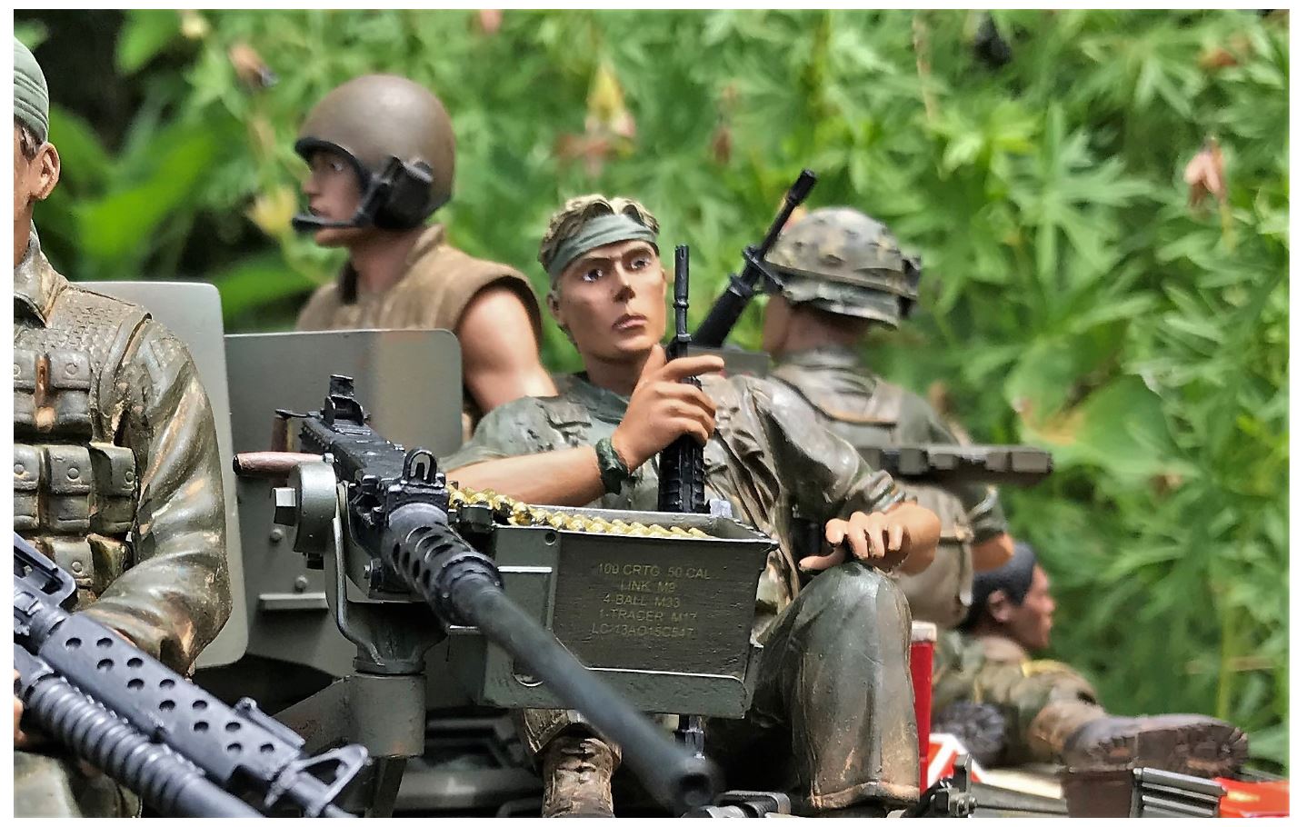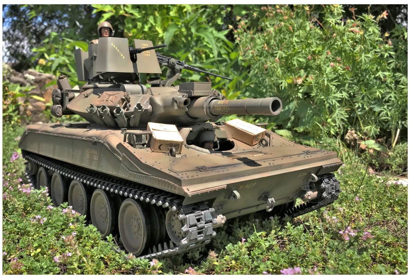 To warm up the winter, here is a Vietnam era Sheridan. Its the Tamiya static version converted to RC with Clark control board, Mato gearbox, Vietnam modifications, etc. The figures and accessories are conversions from Sol Models, Verlinden, Dragon and other. Pictured in my wife's garden last summer.