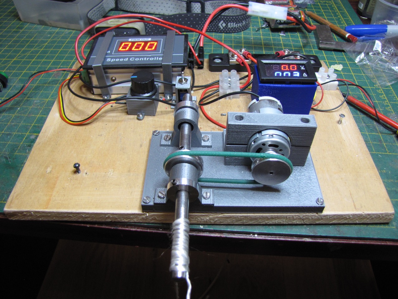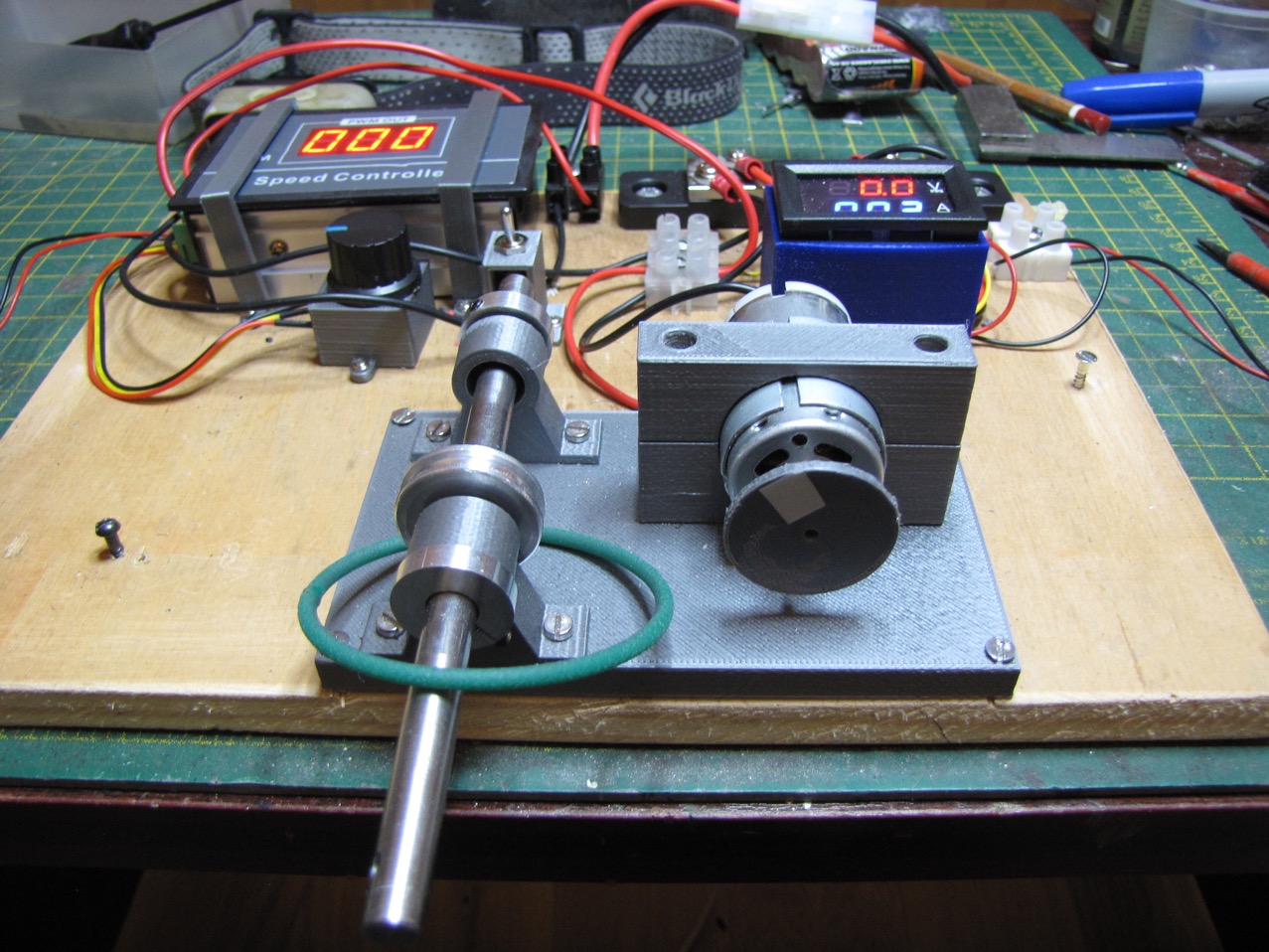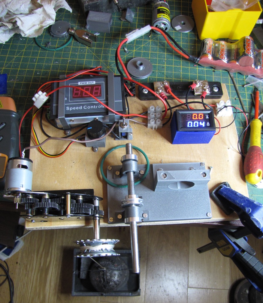 The test rig was made to measure the amps drawn, and provide an adjustable voltage supply. The addition of pulleys and a drive shaft running in ball bearings, enabled me to measure of weight lifted and stall amps.