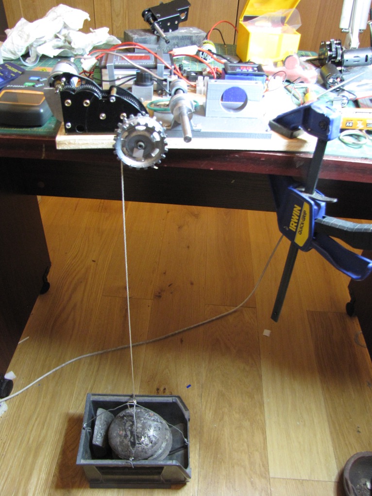 I decided to test my two gearboxes by seeing what weight would move the gears, the motor being taken off. This was achieved by wrapping cord around the shaft and putting weight into the container suspended from it until the gears started to move. This was tried at different gear positions and identified a problem with my 4:1 gears, when a substantial amount of weight had to be added at one point. The meshing points of the various gears was marked with a spot of white paint, the gear stripped and examined under a magnifier. This identified a small spot of foreign matter stuck solid, that had not been removed when cleaning. This was removed with a sharp blade and only went to show that a minor issue could result in a major problem.