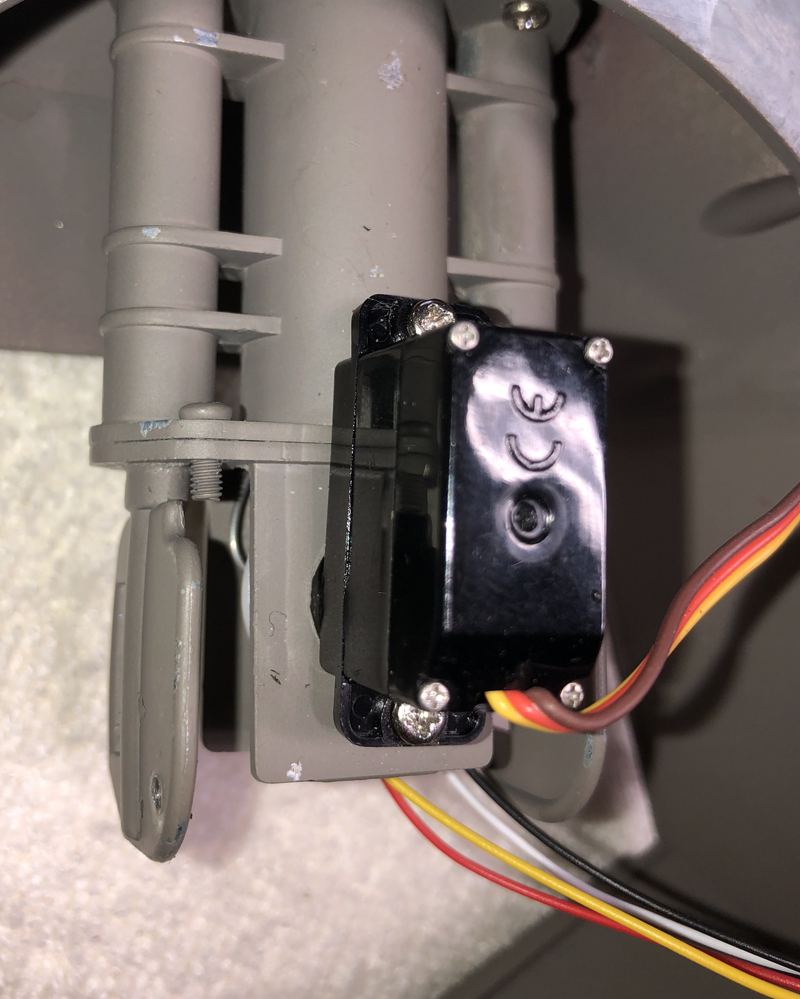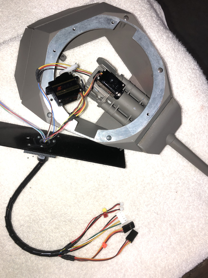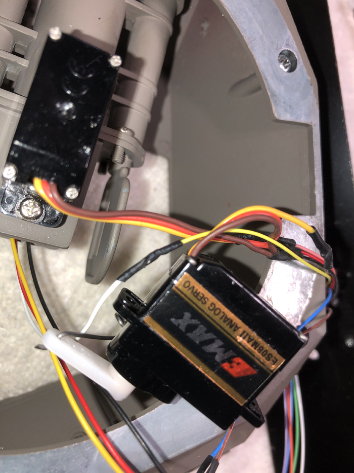 (Phenomenon b initially led to panic as the arm of the servo wrapped up wires resolutely. :O I quickly realized it would be good to remove the servo arm not only from the gun, as I had already done, but also to remove the servo arm from the servo, too. :S )