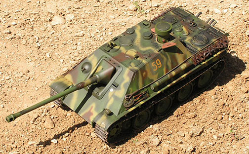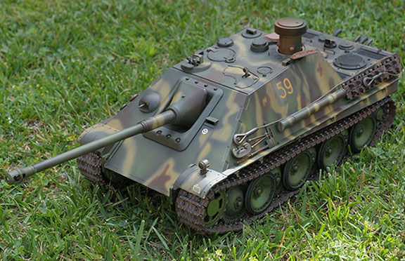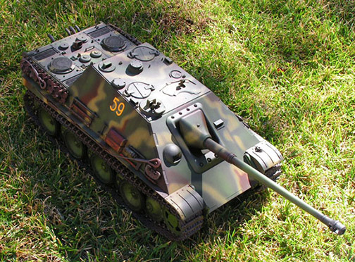 This is my Jagdanther and the build started December 26, 2007 and it was up and running in Feb 2008. The tweaking and improvements including the addition of the Daryl Turner Metal Trunnion; deleting the clutch gears for solid gears in both the traverse and elevation units continued right through to this summer. The initial build included the Impact Glacis Sprocket Guides, Impact Tracks, a Daryl Turner gear box mount brace and 2 metal elevation arms. The tank is a backyard runner with a TBU. The emitter is in the barrel. The images are a pictorial guide of how the build progressed. Enjoy