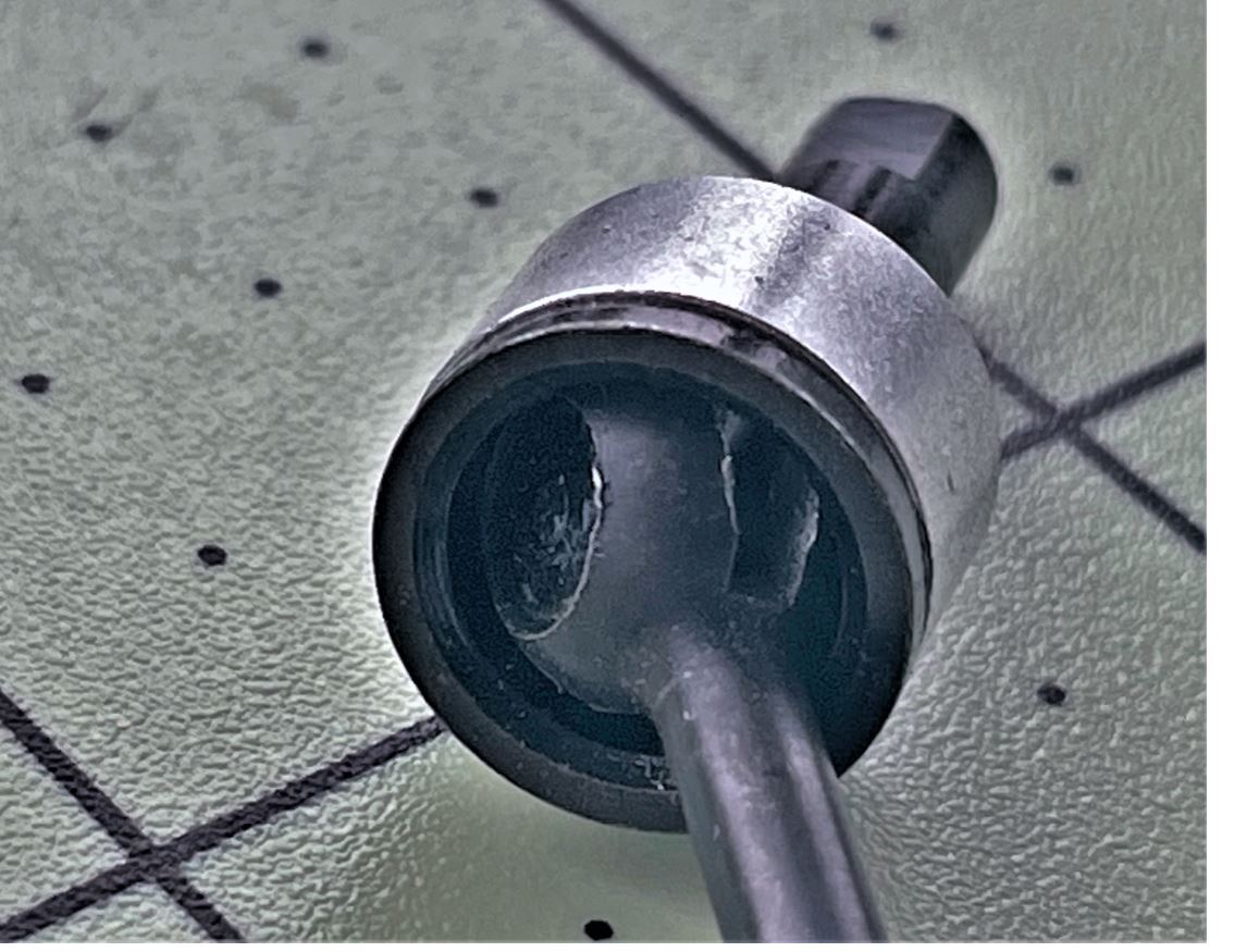 The ball bearing needs to be hammered fully into place at the bottom of the arm. Careful not to destroy the bearing in the process.
