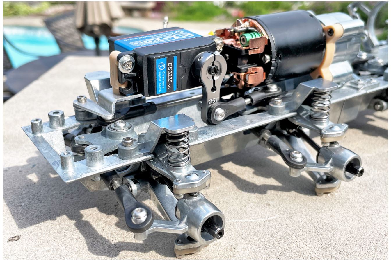 Experience with the TPZ-1 Fuchs build last year taught me that a steering servo on a multi steering axles vehicle need to be as powerful as can be. Optimally, each axle should have its own servo. The design of this kit is having all four axles on one servo... Space is limited. Let's go with this design for now but let’s find the most powerful regular size servo available. I have purchased this nice 35kg servo on Amazon. Much better that the less than 20 Kg given by regular servos. Not sure the torque of a 20kg servo would work well. Testing is promising but the real test will be with the tires on. This bitch will turn.