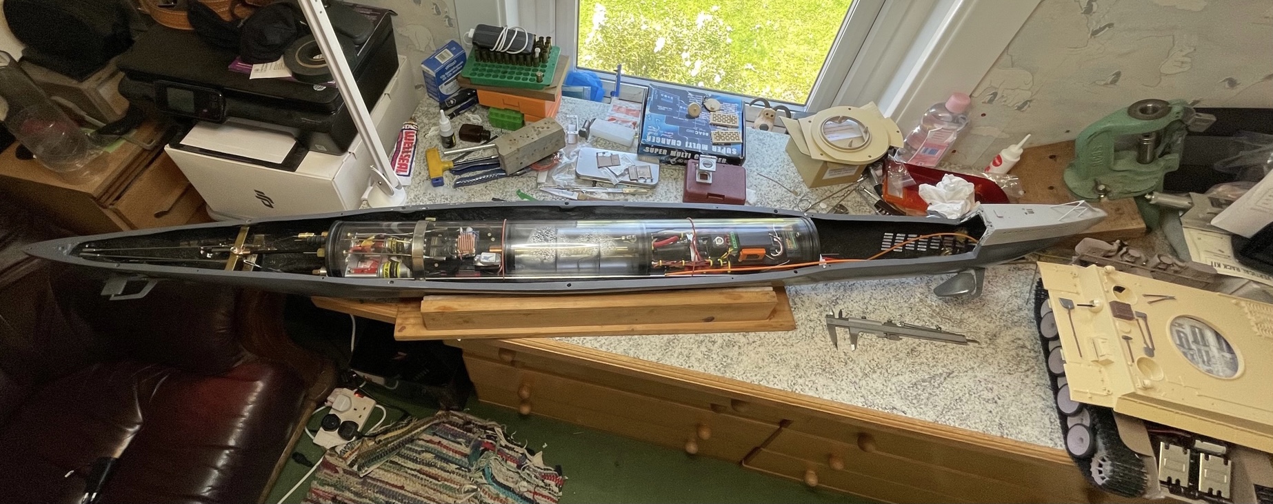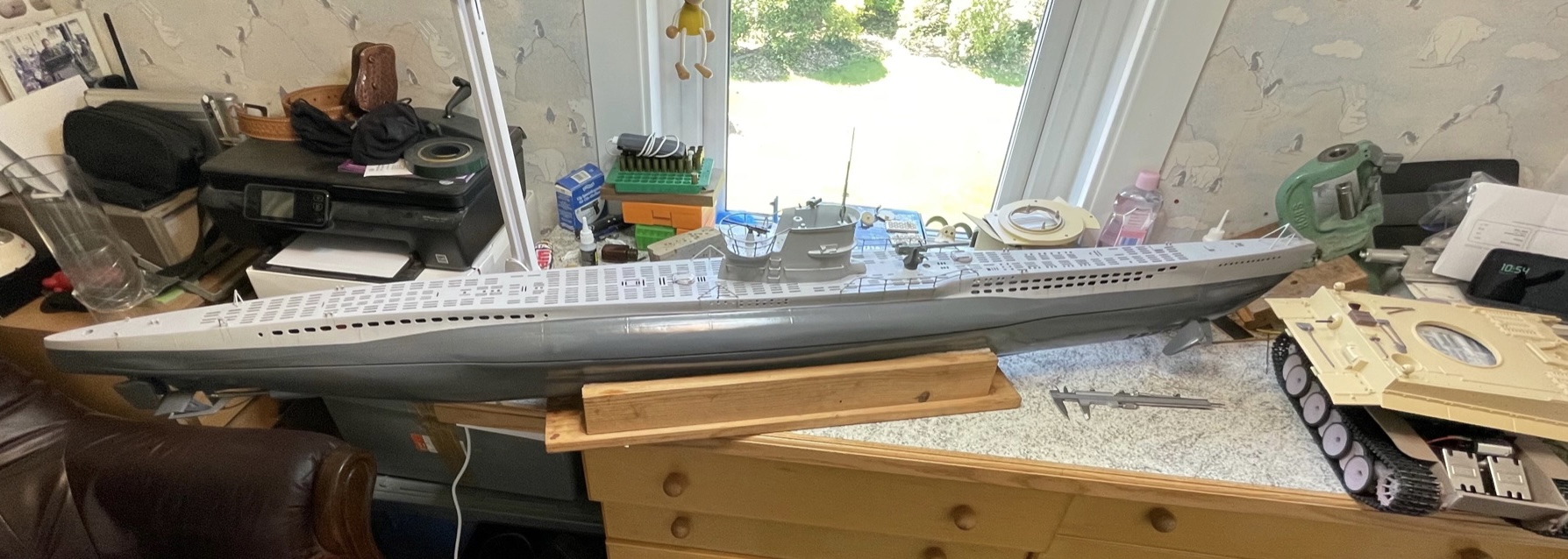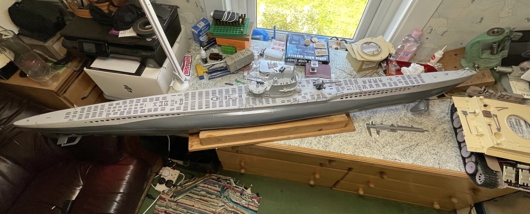 The Tiger is undergoing a respray, I left it sitting in the window and the sun bleached the paintwork that was exposed to the sun leaving me with a two tone tank! What’s more, that was British sunshine so not exactly Sahara desert strength. Below are some photos of the sub with a part painted Tiger to its right.BarryC wrote:Welcome!