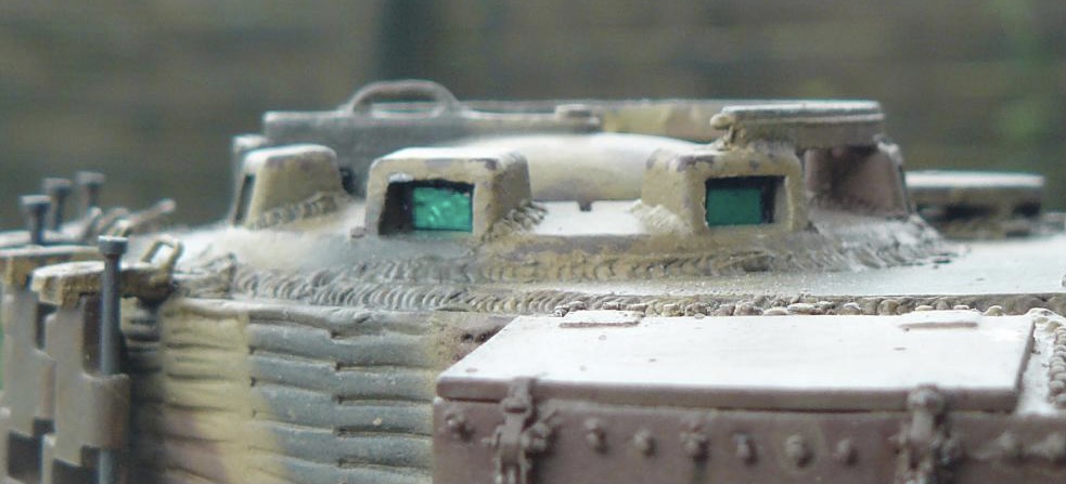 For episcopes, the simplest and when it is possible? is to use those shown in the photo above, because easier to paint, a light black line around the perimeter, and a "stained glass" paint color green, slightly bluish or shiny, see Mig paints, some use an aluminum paper sticker, on which is added a green plastic film, etc.etc.
