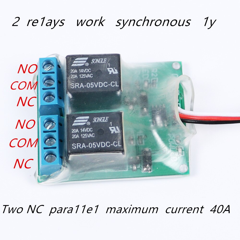 - Turn the switch on the remote control (OFF->ON), the green LED lights up and the relay starts to work.