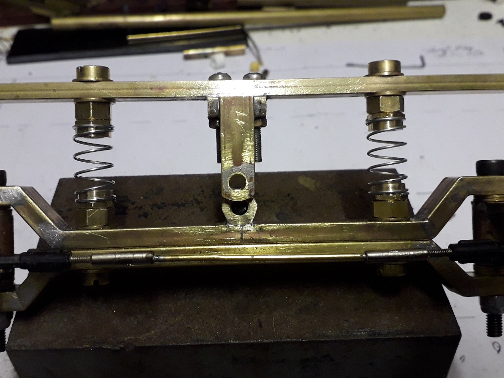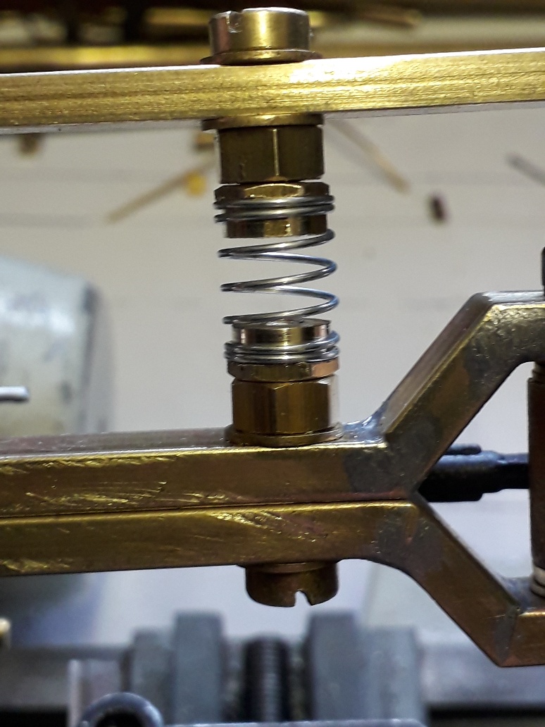 axle engaged in the pivot, the spring upper and lower mounts have been turned down in the lathe so that they fit approx 3mm inside the spring, again to make sure they are securley located on their mounts and cannot move when in use.