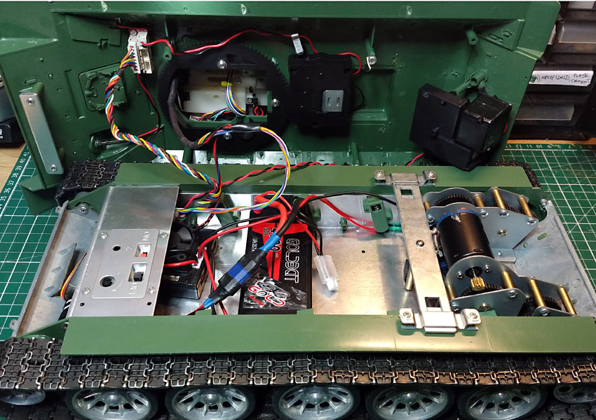 Having finished the speaker box (fitted with a Visatron FRS7, about as large as I could go really) the rest of the internal upgrade for this build could go ahead. As can be seen this includes the mentioned install of the Clark TK40SP (supplied by Mr Maxmekker here), a 2s 4600mA Lipo, a Tarr smoker - relocated between the gearboxes in the lower hull with removable smoke tubes: