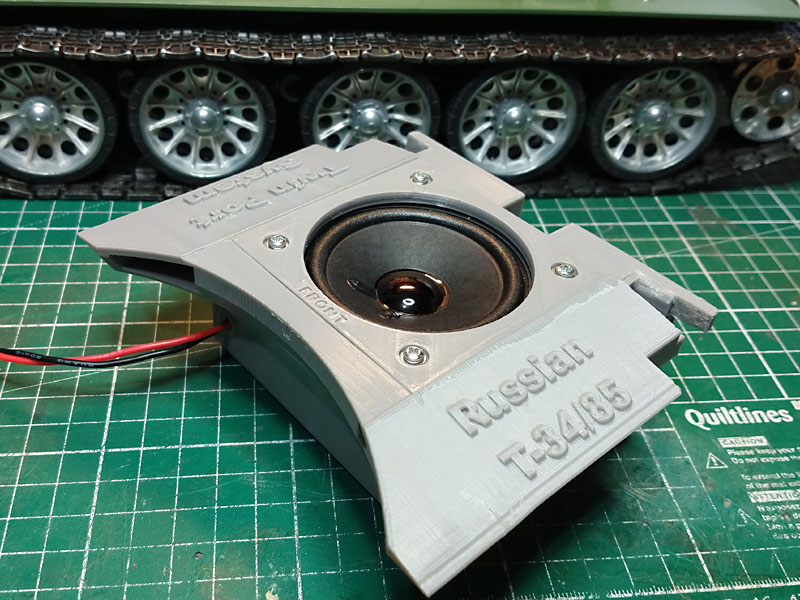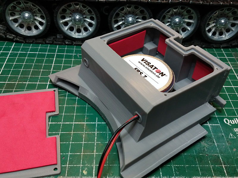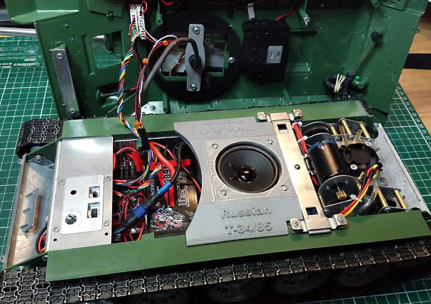 The following couple of pics are of the new speaker and speaker box. This is a design I first developed for my Chieftain and adapted for the Taigen T-34. In fact it ended up being quite a task. To gain the internal volume I wanted (as with the Chieftain) involved utilising every tiny bit of space available. In the end I extended the box under the Taigen quick release mechanism for the upper hull which entailed reversing the mechanism itself and, extending the box forward, entailed relocation of the universal unit for the 360 turret: