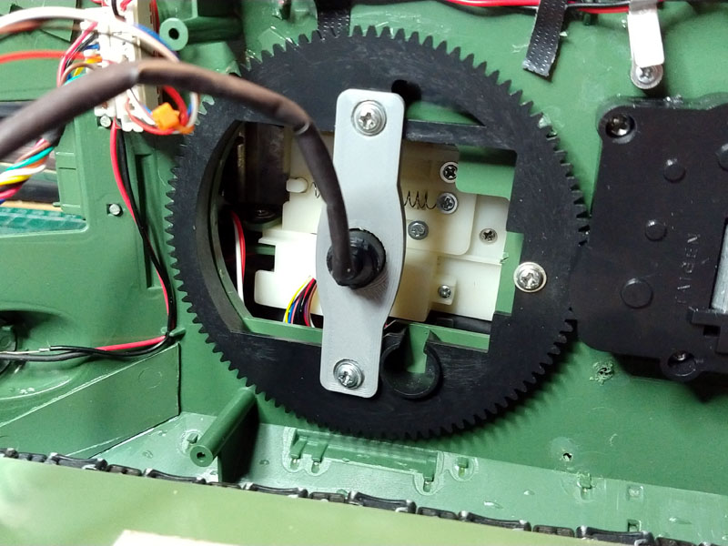 The 3d printed bridge that relocates the 360 unit, seen as follows, places it dead centre . This means that no matter where the turret turns the tail of the harness stays pretty much exactly where it sits below the turret. This means the speak box can extend further up the hull than before and actually under the turret gear ring;;