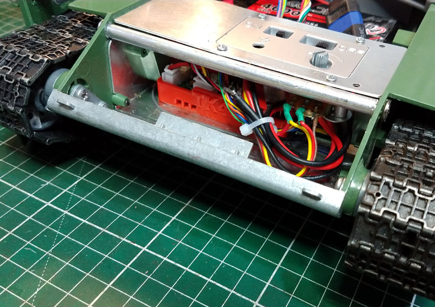 Squeezing this all in between the little space left by the Christie suspension was something of as battle itself. To accommodate the stock switch mounting plate and keep it in place I had to brace the front of the hull, as can be seen. The upgraded 10k volume control (works much better then stock) also takes up room so it was a real bonus using the S-Bus version of the TK40 because it made it possible to use a mini receiver (which also has built in battery voltage telemetry if you have a radio to utilise this!)