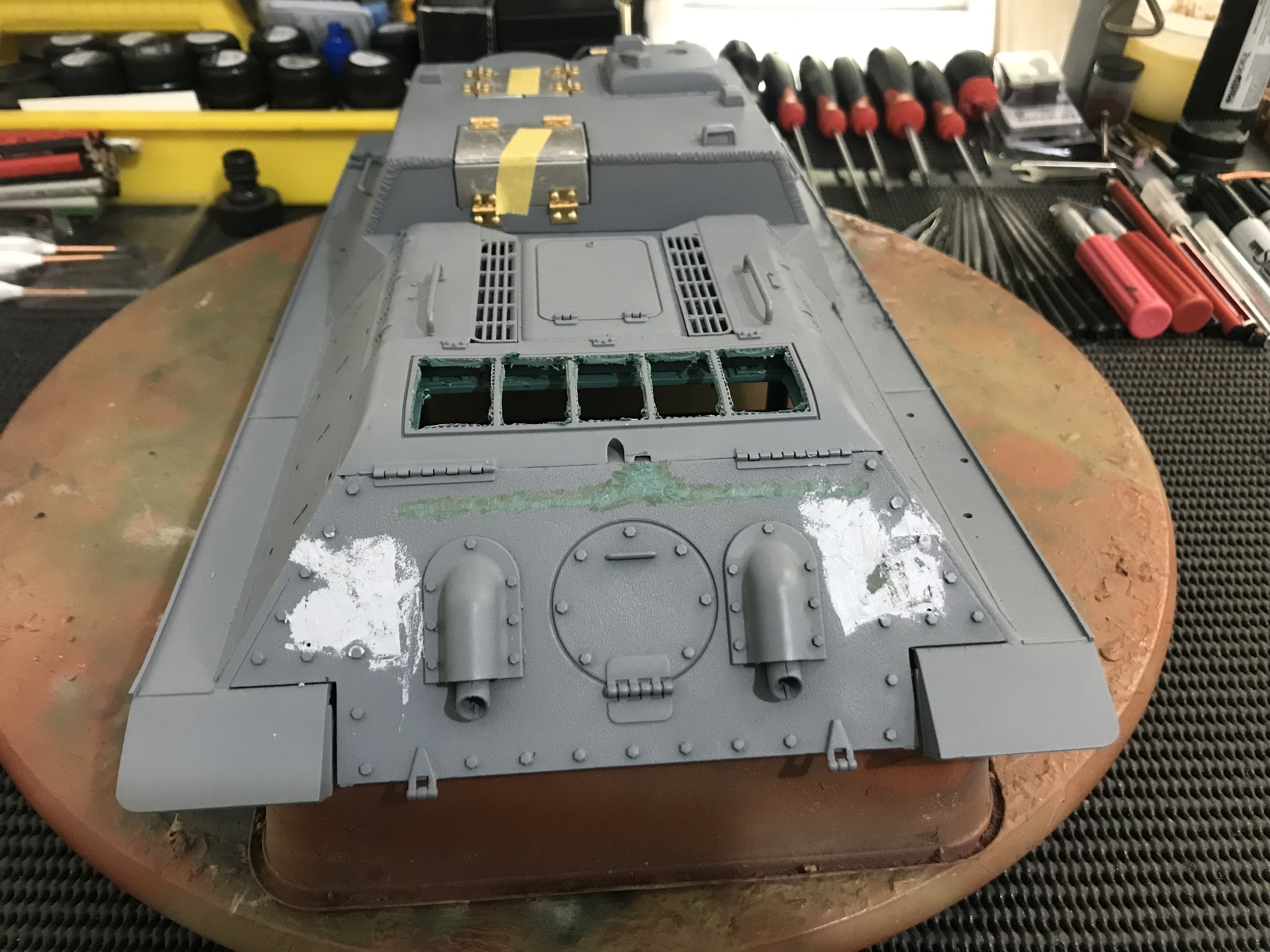 I also filled in the sockets for the unused smoke canister brackets as the late SU85's which this is, they were not fitted.