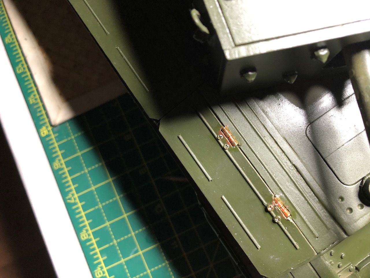 Here's where I used small doll's house hinges to bond the storage bin lid to the hull of the tank. The lid opens nicely, but underneath both sides of the hinge are fixed with a layer of JB Weld and spectacle self-tappers (bought in a pack of hundreds cheaply, on Ebay). So- it's a reassuringly secure fitting. All it needs now is some Olive Drab SCC15 touchup. :D