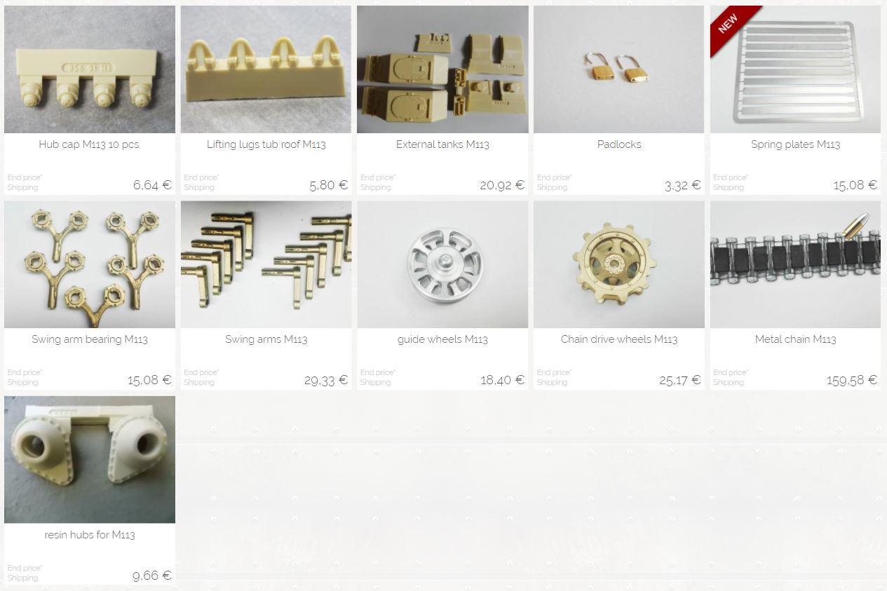 - Tank Modellbau M-113 metal tracks with rubber pads, sprockets, idlers, torsion blade suspension, sprocket hubs, tow hooks, road wheel hub caps.