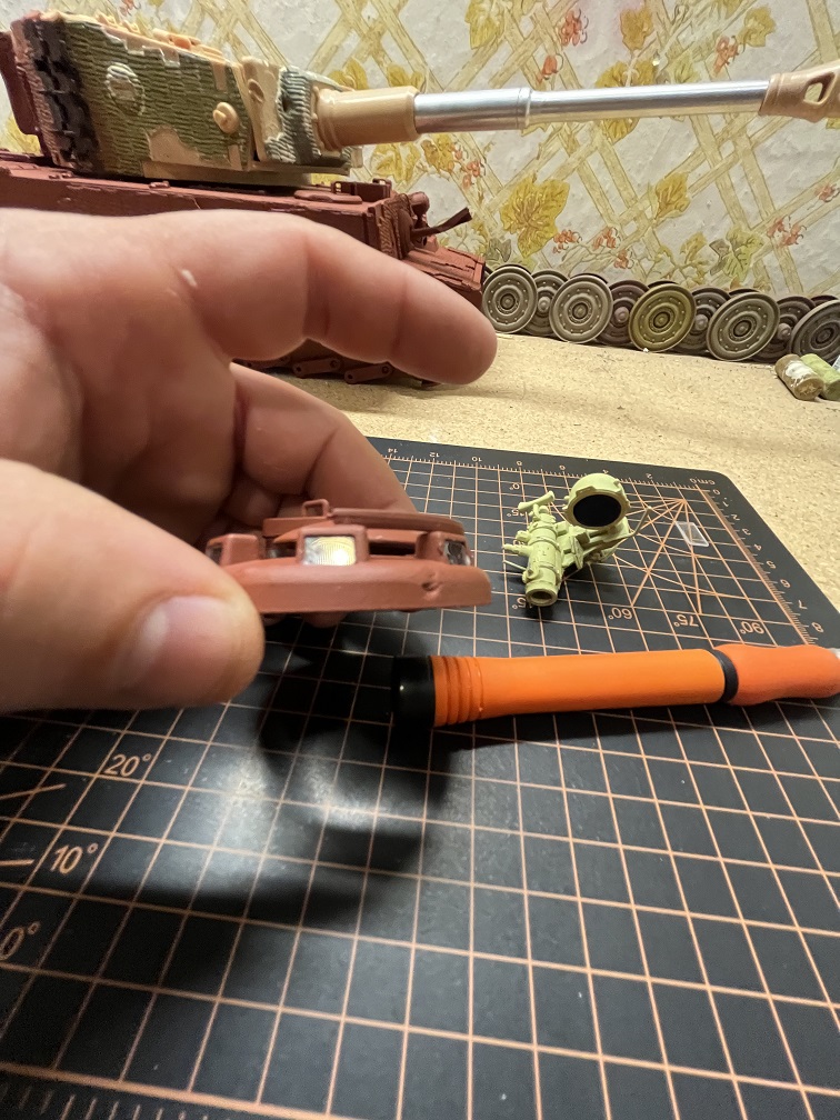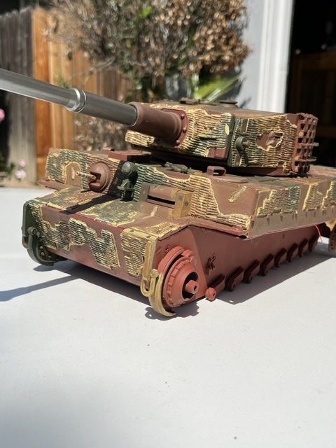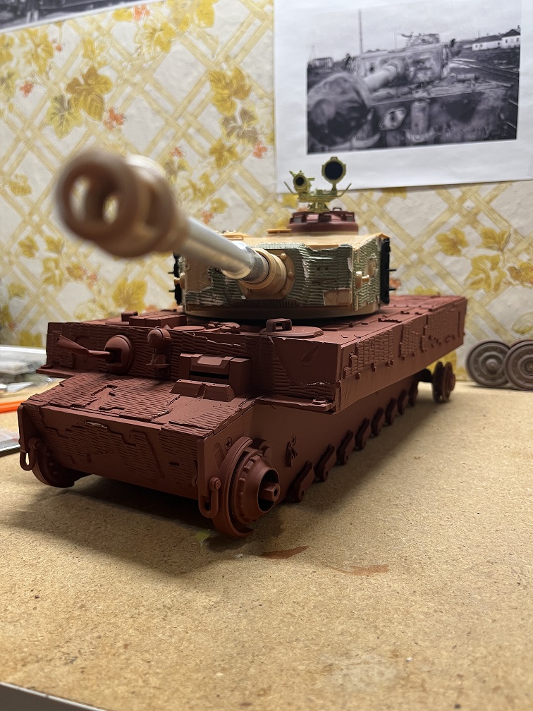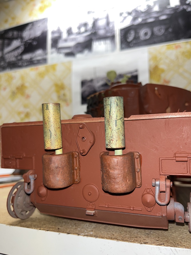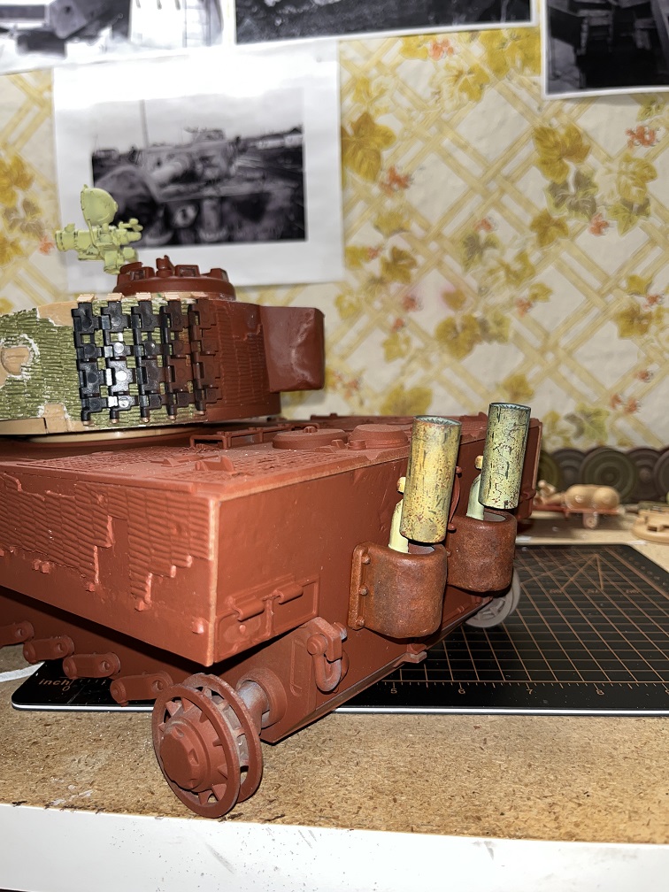 Yeah definitely, I still have to “weld” on the new replacement cupola and finish the rear storage box. Since it’s also a “what if” tank kessel Germany wasn’t captured in the spring so tanks were able to be sent in for repairs and even overhauled or retrofitted. In this case this particular tiger was knocked out receiving a hit from the rear, it received a new rear armor plate, engine and flame suppressor exhaust along with the vampire night vision system.Herr Dr. Professor wrote:"Survivor" is right! You are creating a remarkably weathered, battle-worn look, the kind that should make even Bix jealous. It's interesting work!