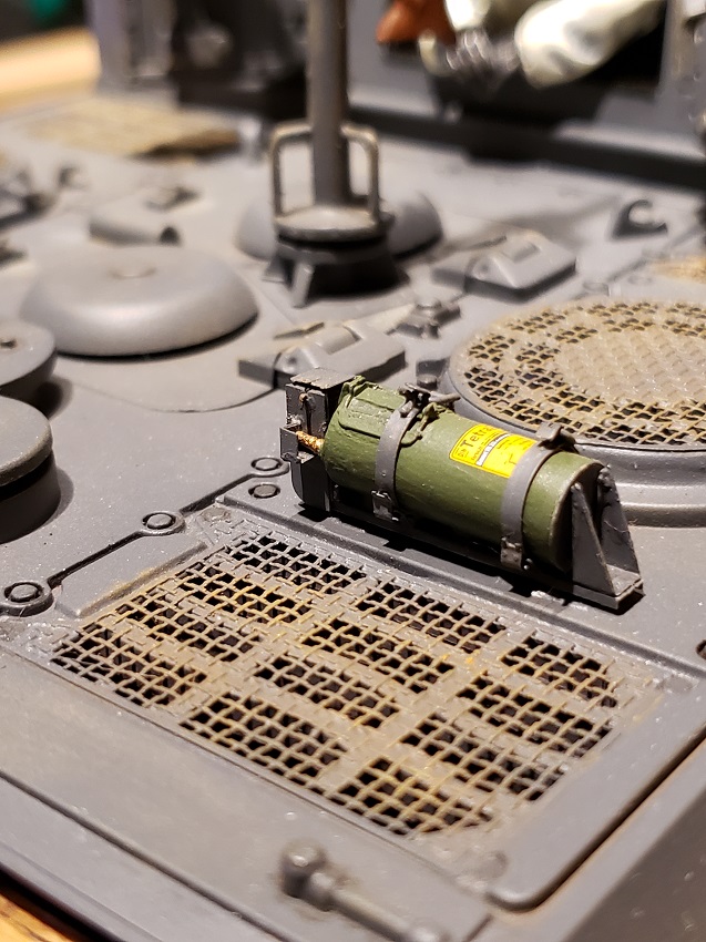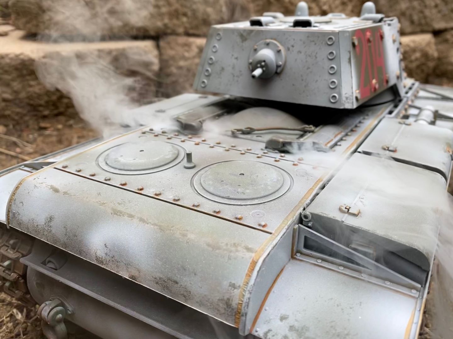 Mine was a static KV sold "for collectors", no electronics and just basic mechanics - plastic gears and tracks. I added a speaker and main board. This is my first foray into using chipping fluid. The biggest modification, the reason I started this tank in the first place however, was to reroute the smoke exhaust. The original vents are solid, but there is a hollow metal aftermarket replacement. Easy, just plug them in. Nay, nay! The gearbox is so close to the deck I had to fashion a brass detour for the exhaust tube. It works, as you'll see.