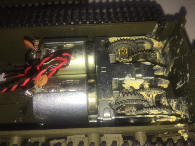 First I had to repair the left track and reattach the front track idle wheel which was missing some parts. After some time I managed to get the tracks back on the Tank then added noise capacitors to each motor as they are not installed or included with the "wired remote control system" then wired the motors with 1.5 mm micro JST connectors so I could connect a single 1.2 v Ni-mh batterie to the motors and test them and the tracks after repairs and see what happens.