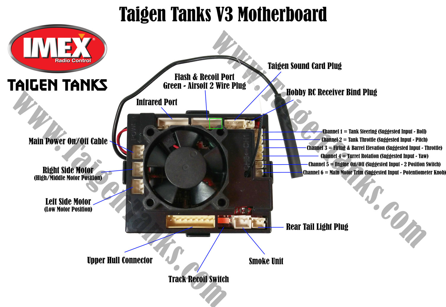 I'm not saying you don't know what you are talking about, but I'm confused why you posed a wiring diagram of a HL 5.3 system? The Taigen v3 has a completely different wiring diagram than the HL 5.3 version you posted. I'm sure the BB diagram is probably correct if this is a HL Sherman converted to Taigen electronics, but I'm not sure what tank he has (whether it is Taigen or a HL Sherman). We know Taigen doesn't have both BB and IR on the same tank. Their tanks are either sold as IR or BB, but not both like the newer HL. The Taigen V3 doesn't have a specific cannon LED slot that is separate from the high intensity slot like the HL v6 or v7 boards. I'm not sure what the voltage is that comes out of the Taigen LED port. I think that is the big question here. If it puts out too much the LED will need to have a resistor on it to limit current. I've seen a lot of posts adding the high intensity to all kinds of boards, but can't find any fitting a standard LED to a Taigen V3.