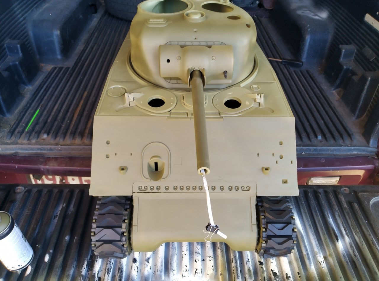 I sprayed a light thin coat of Olive drab to all the facing surfaces for the photo op , still didn't come out that well if you spray a heavier coat I found the Drab goes a real deep hue and looks fantastic . If you can see between the turret bustle and the can of spray paint you'll see a dark patch, that is not a shadow it's the effect I mentioned .