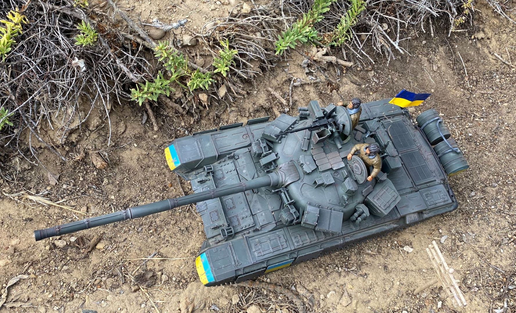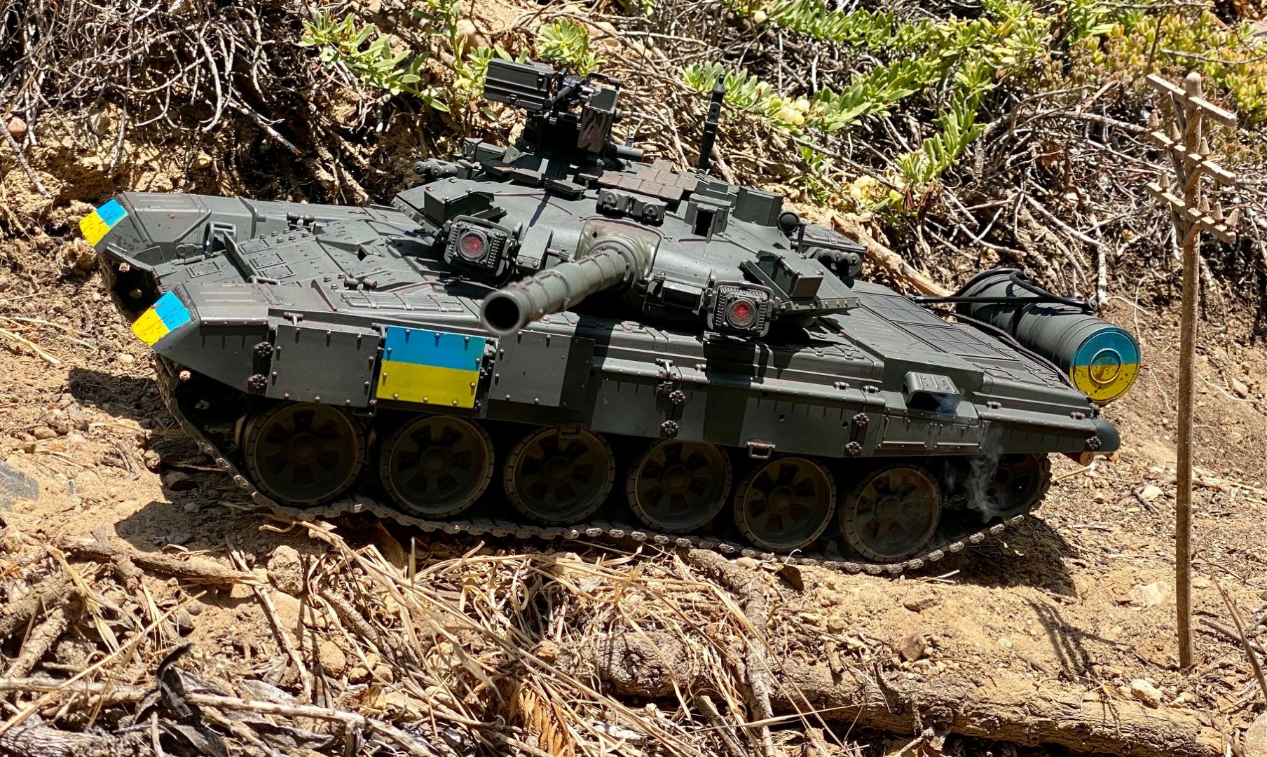 This is a Heng Long T-90, with markings indicating it has been captured by Ukrainian forces. The idea for the markings were taken from photos of the real tanks, they are spontaneous and ad hoc, therefore he placed them using calculated guesswork, where they'd be useful.