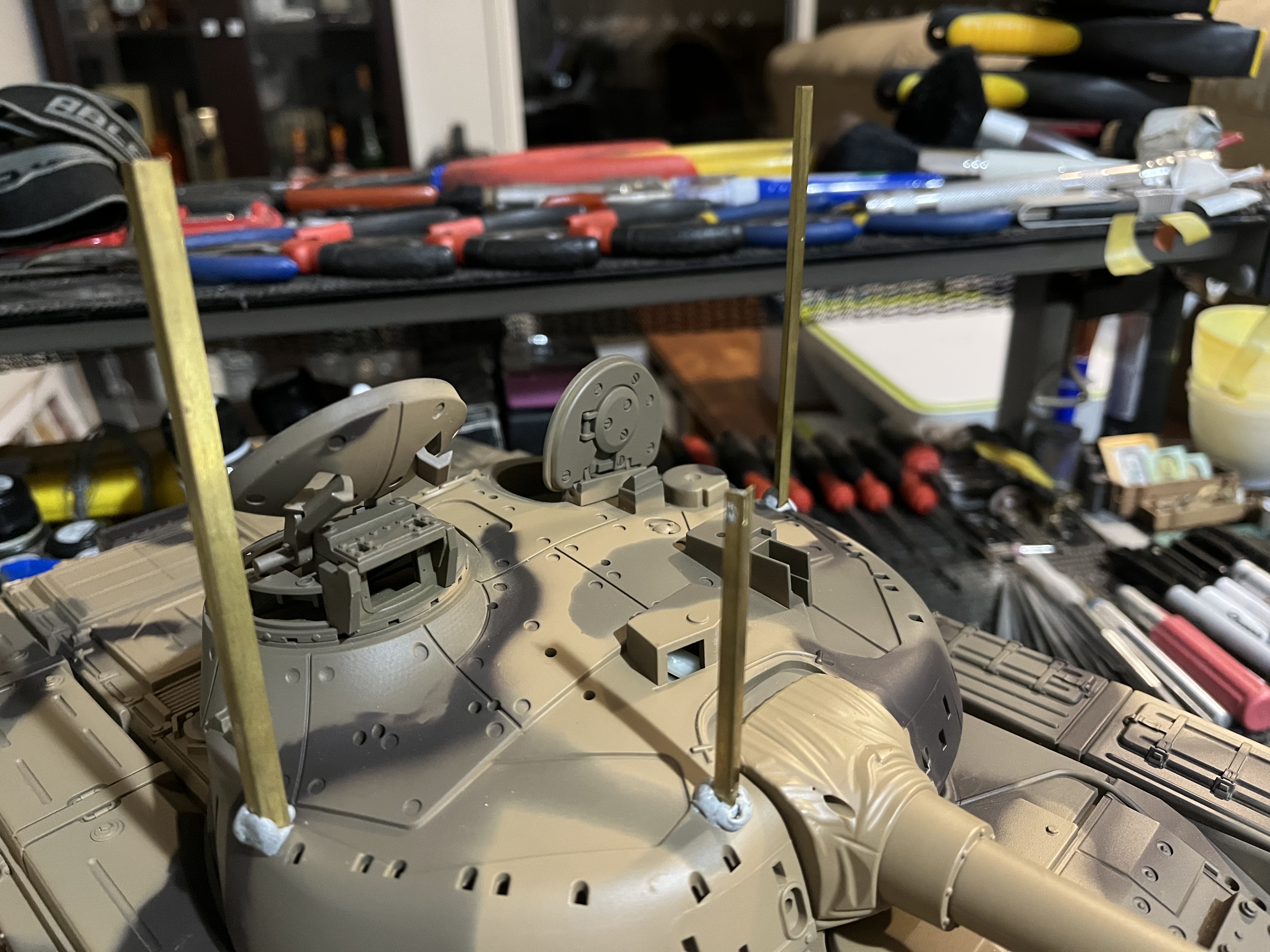 Beginning on the upper now. True to form I just can’t have a factory new tank, and as the machines now seen getting around the Ukrainian countryside are in various degrees of dishevelment , I’ve removed one front mud flap and one rear rubber skirt.