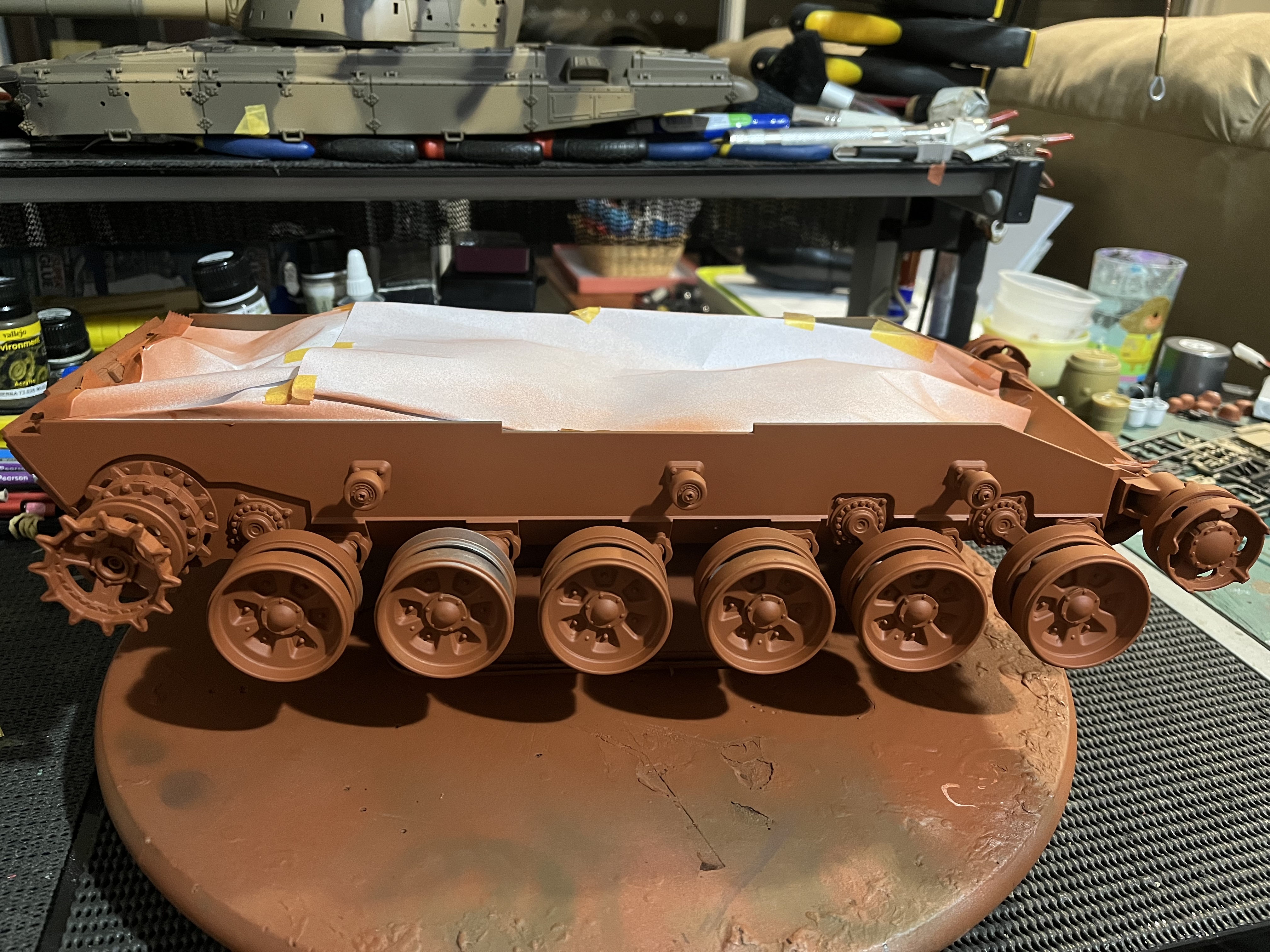Ive just removed the tyres from the roadwheels and hit the lower hull with primer.The smell of primer drives me nuts :shifty: :shh: