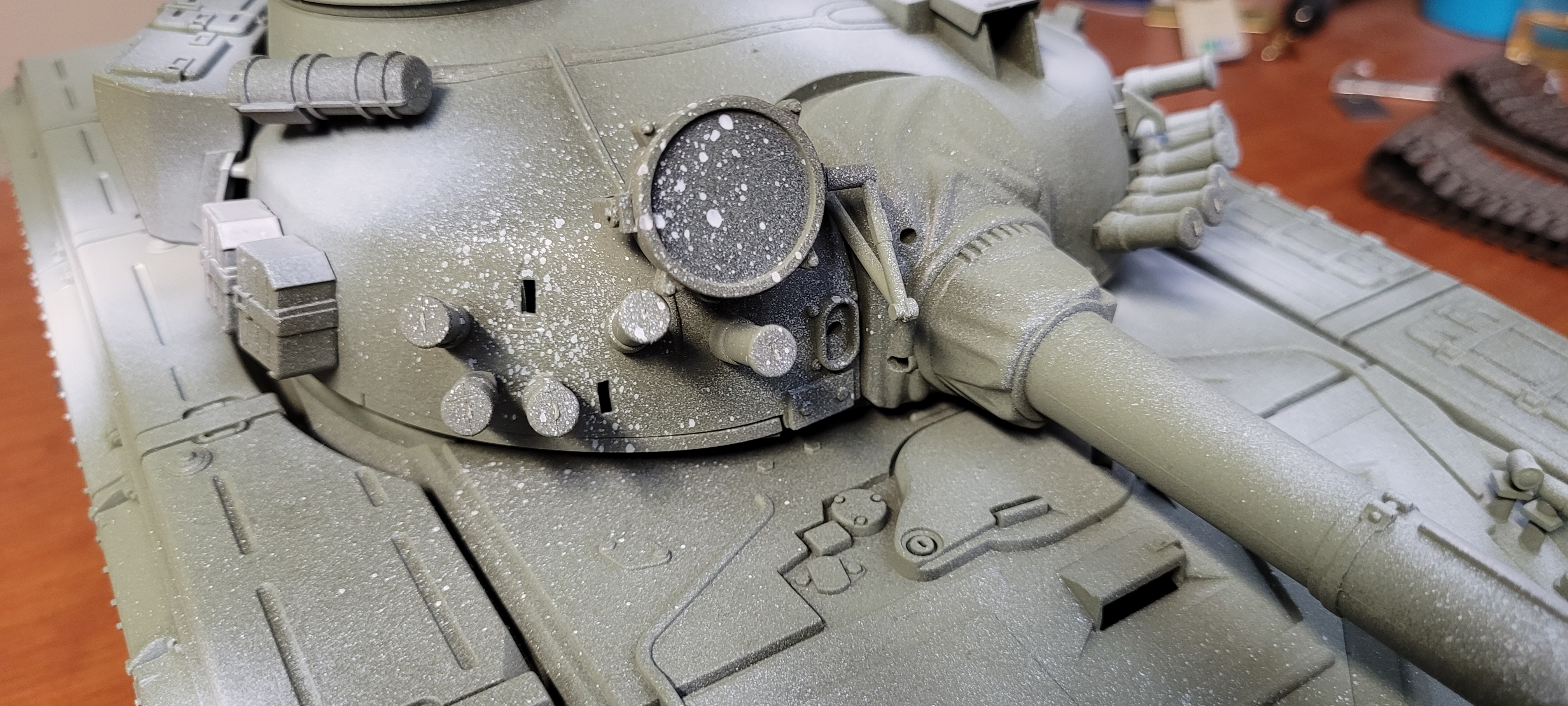 The tank is a HL version 6.0 T-72 I picked up used on marketplace. Everything is working but it suffers the usual mass assembly woes of mold lines, seams where there shouldn't be, textureless surfaces and crudish details. The PO twisted the parts off of the sprues, so lots of those twisty bit remnants, poorly positioned and glued details, and a sloppily applied winter camo to finish things off.