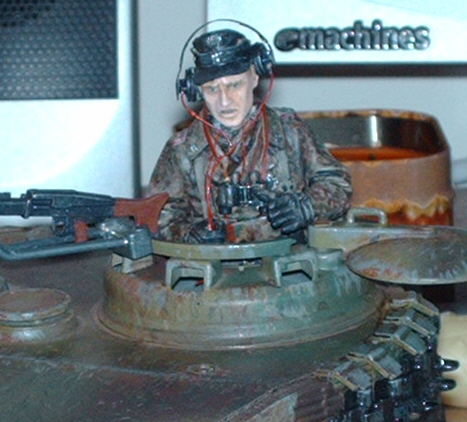 Here isthe Commander of TIGER 304. It is a Verlinden Body with a head whose manufacturer is unknown. I picked up seven heads for five dollars out of a bin at a hobby show. The Headphones, and other items are scratchbuilt.