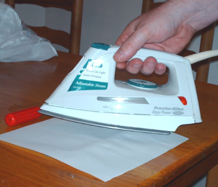 Once the iron is heated press down on the cover paper. hold for 10 seconds, Then begin moving the iron back and fourth. Continue ironing for about three minutes.