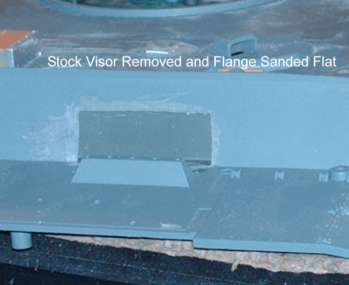I removed the stock visor. The bottom is not attached, so it comes out with no problem. Once it was cut free a file was used to remove any rough spots.