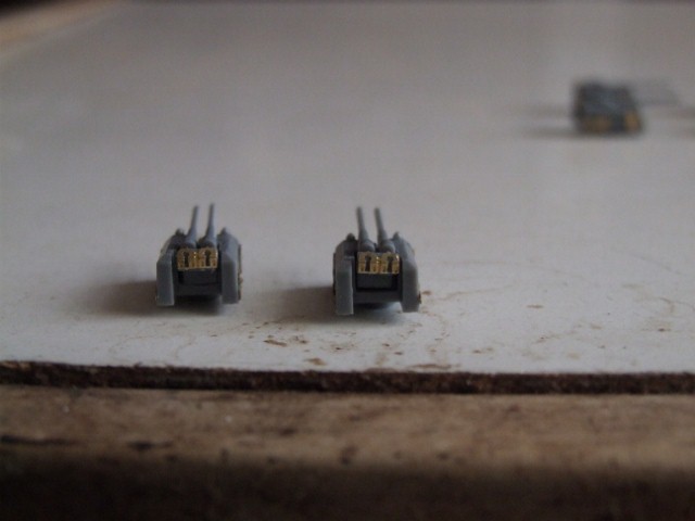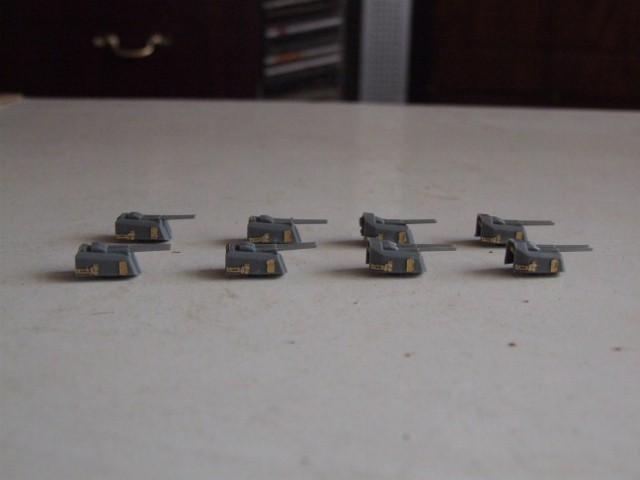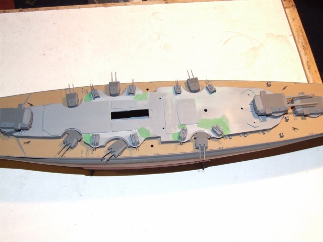 , on the AA turrets alone there are 72 PE parts, that took me ages to put them on. what make it that much harder to build the model is, that the PE parts have to be put on in a order different to the model instructions, so you have to go from one set of instructions to the other to make sure parts go on in an order that dont obstruct, or hinder you with another part of the build :-[ :-[ :-[. as you can see from the photos, progress is slow, but it is starting to take shape, i have nearly finnished the painting on the hull, just the baltic camo' scheme to do there, the middle deck section isnt glued in yet, just placed there for photos,, all the main, secondry, and AA turrets, are made and painted, i have to install some of the railings before i fix some of the turrets down. at the moment i am in the process of making and folding the airplane catapult, which is really fiddely, but, such is the nature of the beast. i hope you all like the photos