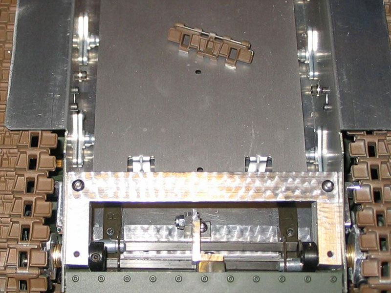 He has designed and machined a custom front hull brace and a pair of new machined idlers with a spring return setup. While not difficult to install, he used my hull to do some advance parts prototyping and was kind and installed the new parts for me. The goal is simply to keep the Impact Metal tracks on during the critical moments of a play rc tank fight and not become a static pill box!