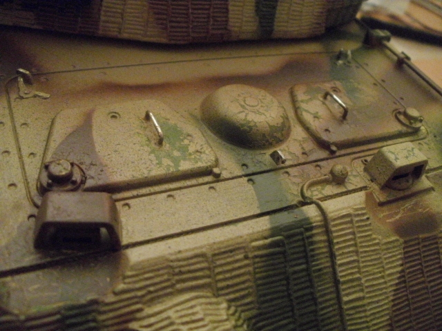 Here's some pic's off work in progress. The damaged paint effect on the K.T. i did by painting patches of yellow Humbrol matt enamel over the original finish, then spraying over with Tamia acrillic. This causes wrinkles which i then scrape away using the flat of a scalple blade & then scrub with a small brass wire brush. More work do do yet but it's coming on.The Tiger & Pz 4 have both been sprayed German Grey & are next in the que for detailing and weathering.