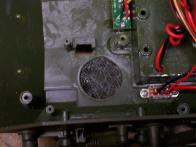 With that out of the way I set out to add my fan cooling. I wanted to locate it so that there would be a faily clear flow path across the FETs and at the same time limt dust intake while providing fresh air. I chose to install my fan directly under the ESC to ensure maximum cooling but there was no place for the fan to exhaust so I drilled 7 holes and covered the holes with plastic screening. I also had to use my dremel to cut out a mounting post and trim back the access hatch for smoker switch. With this setup the air should draw in through the vents in the back, across the engines (bonus), over the ESC, and out the bottom of the tank.
