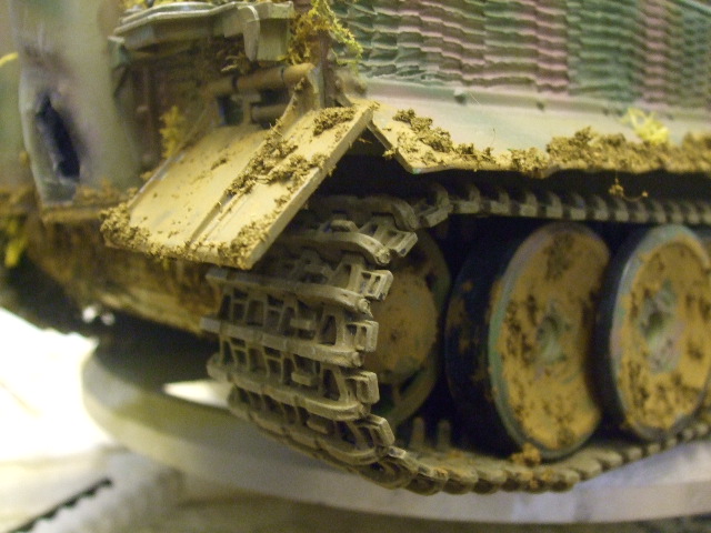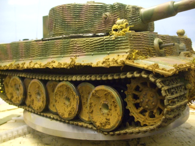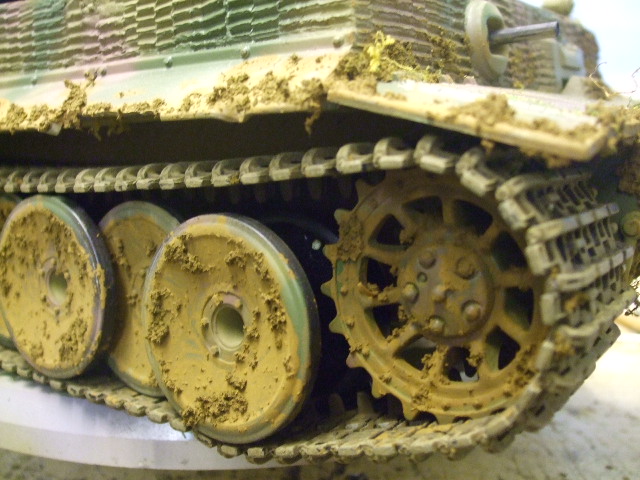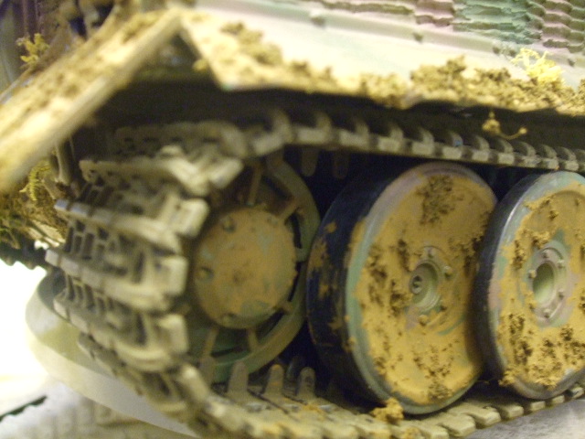 My model room is in the loft, and your right, the lighting is poor, the zim looks ok when you are stood up driving the tank, the dirt blends in better in natural light, the soil on the wheels was made up of green scatter, used on model railways, "quite cheap", mixed with brown ready-mixed poster paint, it forms a great texture and sticks well, plus you have the added benefit of being able to wash it off should you want to change the colour scheme, applied with the finger, Quicker and easier, the idea of this scheme is the tank has driven across muddy fields and smashed through hedges, picking up dirt a foliage.daredemontriple6 wrote:the zimerit looks a little toy like however it is great! i like the way you have weathered the wheels and is a really awesome job overall (i think the zimerit only looked a bit toy like because of the lighting)