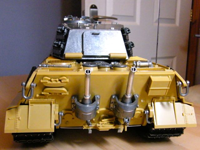 Here's a load of close-up photos, all pretty self explanatory. Torro have done a real good job on the details :clap: , the only obvious one missing is no pistol port on the turret rear door, although they put all the interior detail on, even down to the two handles hidden underneath the plate! Rctank.de have a metal pistol port with chain on their site, one is now on its way from Germany. The block for the commander's guide sight on the turret top is there, just needs a rod fitting, and there are two overflow pipes at the rear of the engine deck which need a piece of tube added to each to go over the side of the hull. Putting my anorak on 8| I have only seen one photograph showing a Tiger II with two overflow pipes on the engine deck, this is in the Osprey New Vanguard book number 1, Kingtiger Heavy Tank, page 12, all other pictures and drawings I have seen have one overflow only at the right rear of the engine deck.