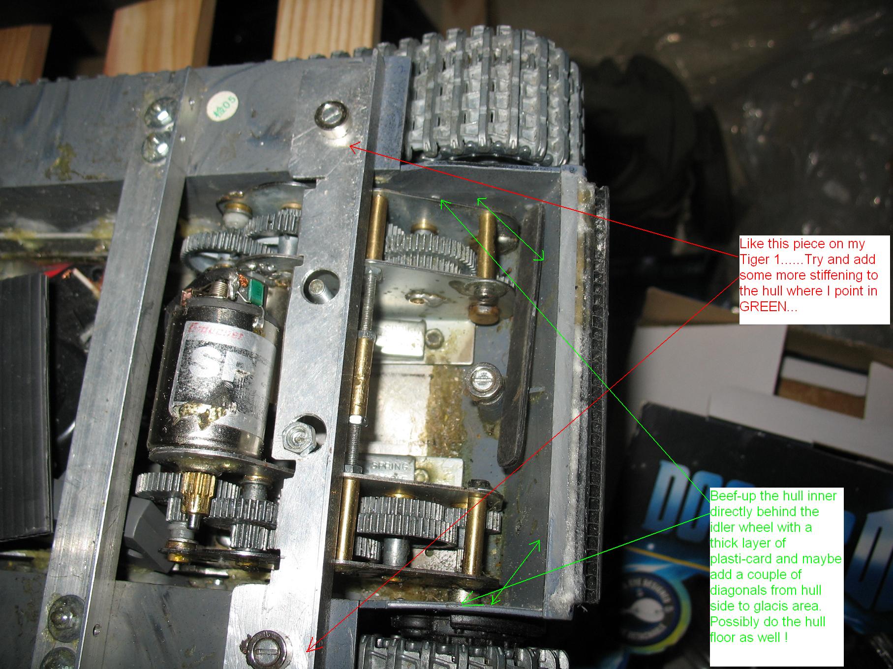 Are there any of the metal cross bracing 'rods' on your gearboxes ??..they are very visible and clamp the two steel plates of the gearbox together it help prevent this flexing that you are seeing.....It is possible that who ever converted the gearboxes did not put them back in after conversion...here is a photo of the gearboxes on my Tiger.....It is all braced 'left right and centre' to ensure that it is Totally rigid... :haha: .....sorry about the 'Writing ' on the photo but it was altered to send to another Forum member who had problems with a KV-1.....you can see the 'gearbox cross-brace mod' that I am referring to..it is just in front of the first piece on angle aluminium.....and it is made out of threaded M3 bar and a spare metal gearbox support....the standard ones are in the gearboxes..and there are two brass ones per gearbox.....
