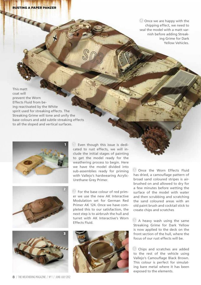 If you're interested in weathering your collection of armour, AK Interactive are about to publish a quarterly magazine on hints and tips on weathering. Apparently its gonna cost 8 euros (or equivelent) and should be able to be bought from high street shops. It can also be bought direct from their website too so they say. I don't doubt it will be an unashamedly plug for thier paints/washes etc as in the FAQ books but as I use them as a matter of course, any advice on how to get the best out of them helps, for me anyway.
